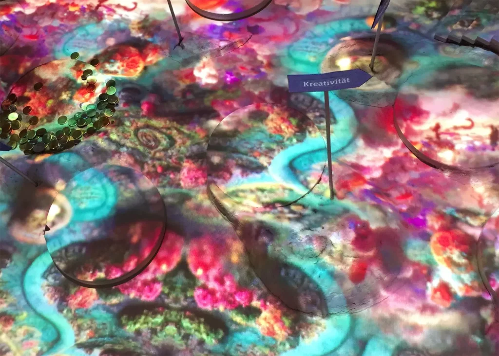 Mittels Projektion entsteht im Ausstellungsraum eine paradiesische Landschaft, in der sich die Besuchenden frei bewegen und ihre Entdeckungen machen können. Dabei begegnen sie zehn ausgewählten Werten in Form von physischen Charakteren, ihren Geschichten und sinnlich erfahrbaren Installationen.